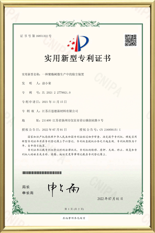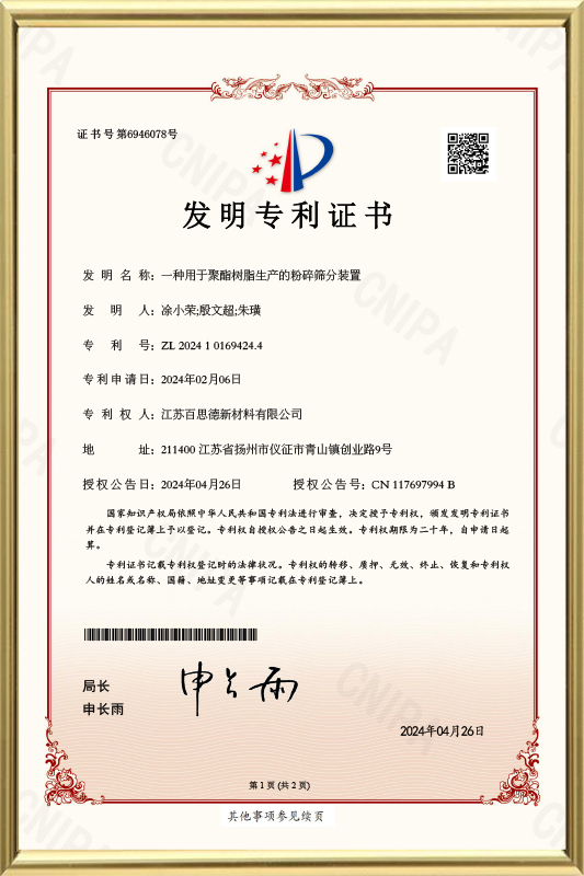 Besd vật liệu mới Dự án mới sản xuất 100.000 tấn nhựa polyester cho lớp phủ bột đã được hoàn thành và đưa vào sản xuất tại Khu công nghiệp hóa học Yangzhou vào năm 2019. Dự án có diện tích khoảng 40.000 mét vuông và diện tích xây dựng rộng khoảng 27.000 mét vuông.