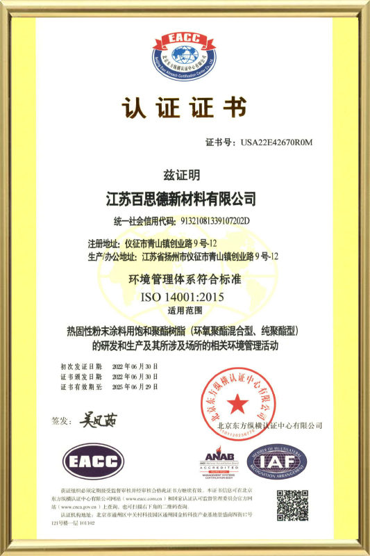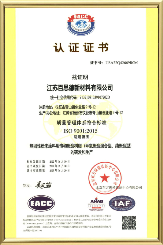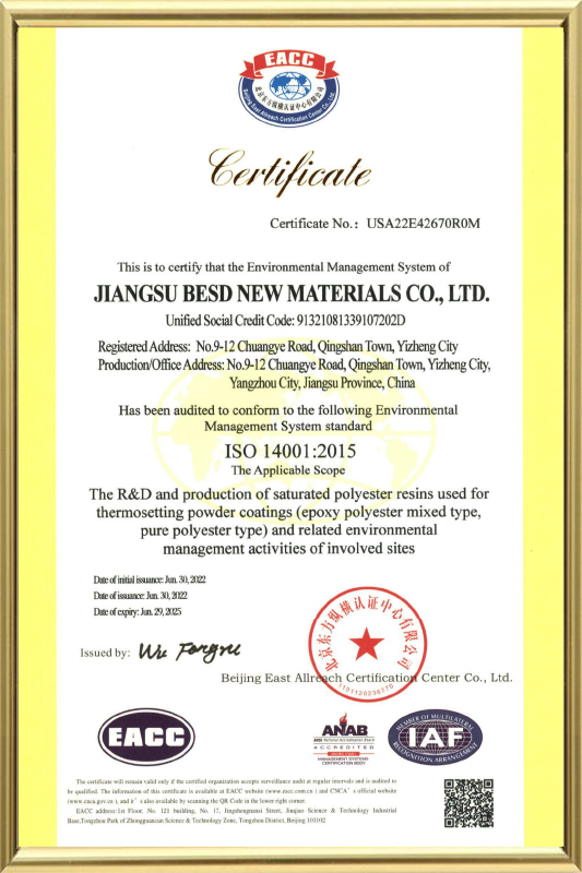 Công ty TNHH Tài liệu mới của Jiangsu Besd. được thành lập vào năm 1998, nằm trong Công viên Công nghiệp Hóa học Yangzhou, Thành phố Yizheng, tỉnh Giang Tô. Nó là một nhà sản xuất từ lâu đã tập trung vào nhựa polyester cho lớp phủ bột.